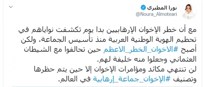 تفاعلت الكاتبة والباحثة نورا المطيري، اليوم الإثنين، مع هاشتاج " الإخوان الخطر الأعظم".