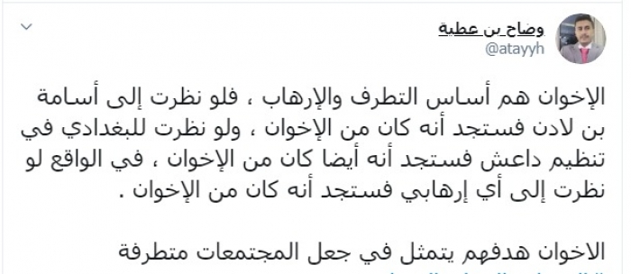 وكتب عبر تغريدة له على "تويتر" رصدها "المشهد العربي": "الإخوان هم أساس التطرف والإرهاب ، فلو نظرت إلى أسامة بن لادن فستجد أنه كان من الإخوان، ولو نظرت للبغدادي في تنظيم داعش فستجد أنه أيضا كان من الإخوان، في الواقع لو نظرت إلى أي إرهابي فستجد أنه كان من الإخوان، الإخوان هدفهم يتمثل في جعل المجتمعات متطرفة".