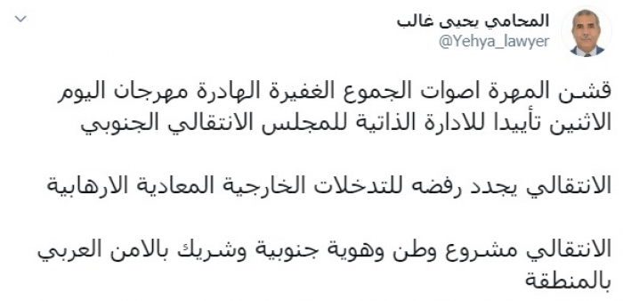 وكتب عبر تغريدة له على "تويتر" رصدها " المشهد العربي":"قشن المهرة أصوات الجموع الغفيرة الهادرة مهرجان اليوم الاثنين تأييدا للإدارة الذاتية للمجلس الانتقالي الجنوبي، الانتقالي يجدد رفضه للتدخلات الخارجية المعادية الإرهابية، الانتقالي مشروع وطن وهوية جنوبية وشريك بالأمن العربي بالمنطقة".
