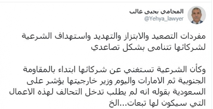 أكد الناشط السياسي المحامي يحيى غالب، اليوم الثلاثاء، أن لغة التصعيد والابتزاز والتهديد في الشرعية تتصاعد.