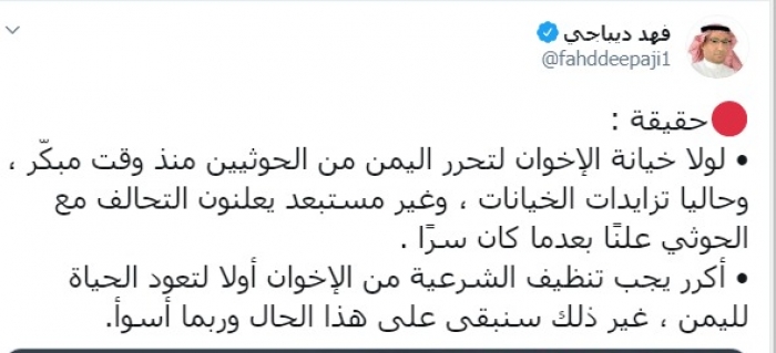 وكتب ديباجي عبر تغريدة له على "تويتر" رصدها " المشهد العربي":"لولا خيانة الإخوان لتحرر اليمن من الحوثيين منذ وقت مبكّر، وحاليًا تزايدت الخيانات، وغير مستبعد يعلنون التحالف مع الحوثي علنًا بعدما كان سرًا".