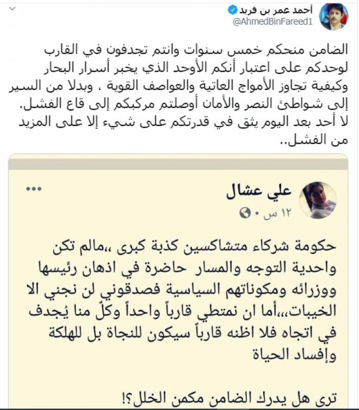 وكتب "بن فريد" في تغريدة عبر حسابه بتويتر، رصدها المشهد العربي": "الضامن منحكم خمس سنوات وأنتم تجدفون في القارب لوحدكم على اعتبار أنكم الأوحد الذي يخبر أسرار البحار وكيفية تجاوز الأمواج العاتية والعواصف القوية".
