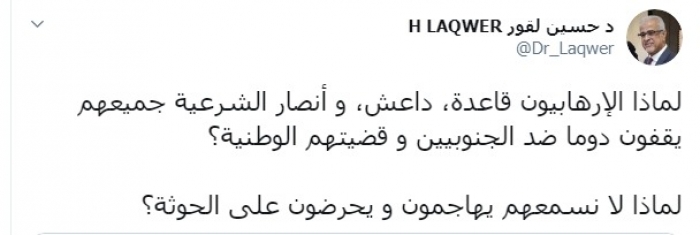 وكتب عبر تغريدة له على "تويتر" رصدها "المشهد العربي": "لماذا الإرهابيون قاعدة، داعش، وأنصار الشرعية جميعهم يقفون دوما ضد الجنوبيين وقضيتهم الوطنية؟ لماذا لا نسمعهم يهاجمون ويحرضون على الحوثة؟".