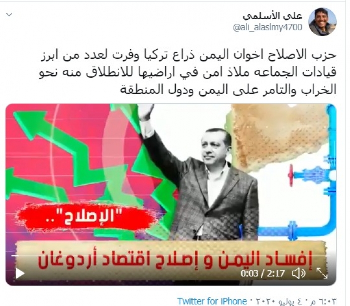 وكتب "الأسلمي" تغريدة عبر حسابه بتويتر، رصدها "المشهد العربي" قال فيها: "حزب الإصلاح إخوان اليمن ذراع تركيا وفرت لعدد من أبرز قيادات الجماعة ملاذا آمنا في أراضيها للانطلاق منه نحو الخراب والتآمر على اليمن ودول المنطقة".