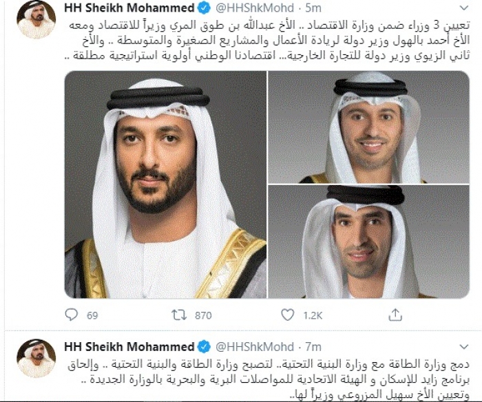 وأضاف: "تعيين 3 وزراء ضمن وزارة الاقتصاد .. الأخ عبدالله بن طوق المري وزيراً للاقتصاد ومعه الأخ أحمد بالهول وزير دولة لريادة الأعمال والمشاريع الصغيرة والمتوسطة .. والأخ ثاني الزيوي وزير دولة للتجارة الخارجية... اقتصادنا الوطني أولوية استراتيجية مطلقة".