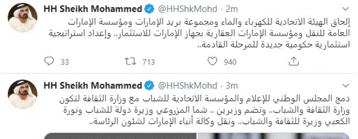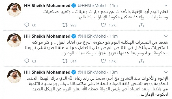 وقال في سلسلة تغريدات عبر "تويتر" رصدها "المشهد العربي": "الإخوة والأخوات بعد التشاور مع أخي محمد بن زايد رعاه الله الذي بارك الهيكل الجديد للحكومة ووجه بتسخير كافة الموارد للحفاظ على مكتسباتنا .. وتسريع مسيرة التنمية في بلادنا.. وبعد اعتماد أخي رئيس الدولة حفظه الله نعلن اليوم عن الهيكل الجديد لحكومة الإمارات".