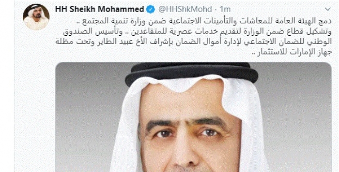 وواصل: "دمج الهيئة العامة للمعاشات والتأمينات الاجتماعية ضمن وزارة تنمية المجتمع .. وتشكيل قطاع ضمن الوزارة لتقديم خدمات عصرية للمتقاعدين .. وتأسيس الصندوق الوطني للضمان الاجتماعي لإدارة أموال الضمان بإشراف الأخ عبيد الطاير وتحت مظلة جهاز الإمارات للاستثمار".