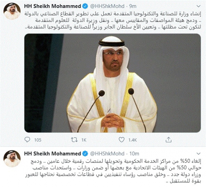 واستطرد: "إنشاء وزارة للصناعة والتكنولوجيا المتقدمة تعمل على تطوير القطاع الصناعي بالدولة .. ودمج هيئة المواصفات والمقاييس معها .. ونقل وزيرة الدولة للعلوم المتقدمة لتكون تحت مظلتها .. وتعيين الأخ سلطان الجابر وزيراً للصناعة والتكنولوجيا المتقدمة".
