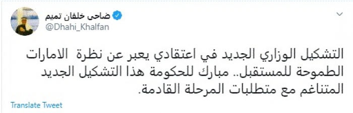 وقال في تغريدة عبر "تويتر" رصدها "المشهد العربي": "التشكيل الوزاري الجديد في اعتقادي يعبر عن نظرة الإمارات الطموحة للمستقبل.. مبارك للحكومة هذا التشكيل الجديد المتناغم مع متطلبات المرحلة القادمة".