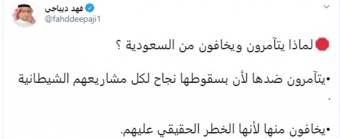 وكتب في تغريدة عبر "تويتر" رصدها "المشهد العربي": "لماذا يتآمرون ويخافون من السعودية؟ يتآمرون ضدها لأن بسقوطها نجاح لكل مشاريعهم الشيطانية. يخافون منها لأنها الخطر الحقيقي عليهم".