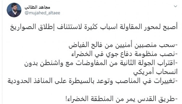 وقال في تغريدة عبر "تويتر" رصدها "المشهد العربي": "أصبح لمحور المقاولة اسباب كثيرة لاستئناف إطلاق الصواريخ سحب منصبين أمنيين من فالح الفياض نصب منظومة دفاع جوي في الخضراء".