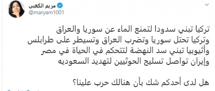 وقالت في تغريدة عبر "تويتر" رصدها "المشهد العربي": "تركيا تبني سدودا لتمنع الماء عن سوريا والعراق وتركيا تحتل سوريا وتضرب العراق وتسيطر على طرابلس".
