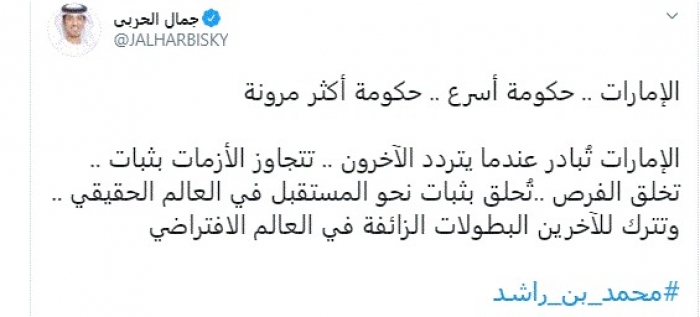 وقال في تغريدة عبر "تويتر" رصدها "المشهد العربي": "الإمارات .. حكومة أسرع .. حكومة أكثر مرونة الإمارات تُبادر عندما يتردد الآخرون .. تتجاوز الأزمات بثبات .. تخلق الفرص ..تُحلق بثبات نحو المستقبل في العالم الحقيقي .. وتترك للآخرين البطولات الزائفة في العالم الافتراضي".