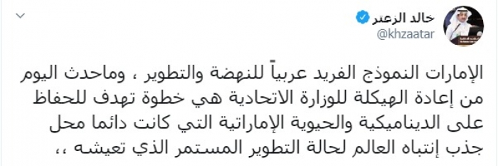 وكتب عبر تغريدة له على "تويتر" رصدها " المشهد العربي": "الإمارات النموذج الفريد عربياً للنهضة والتطوير ، وما حدث اليوم من إعادة الهيكلة للوزارة الاتحادية هي خطوة تهدف للحفاظ على الديناميكية والحيوية الإماراتية التي كانت دائما محل جذب انتباه العالم لحالة التطوير المستمر الذي تعيشه ".