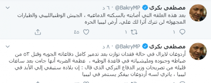 وكتب عبر تغريدة له على "تويتر" رصدها " المشهد العربي":"أردوغان لايزال في حالة فقدان توازن بعد تدمير كامل دفاعاته الجوية وقتل ٥٣ من ضباطه وجنوده ومليشياته في قاعدة الوطية، عظمة الضربة أنها جاءت بعد ساعات قليلة من تصريحات وزير الدفاع التركي الذي قال، إن بلاده ستبقي إلى الأبد في ليبيا ، يا ترى لسه أردوغان بيفكر يستمر في ليبيا بعد هذه العلقة التي أصابته بالسكتة الدماغية".