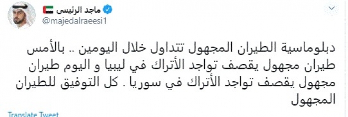وقال في تغريدة عبر "تويتر" رصدها "المشهد العربي": "دبلوماسية الطيران المجهول تتداول خلال اليومين .. بالأمس طيران مجهول يقصف تواجد الأتراك في ليبيا و اليوم طيران مجهول يقصف تواجد الأتراك في سوريا . كل التوفيق للطيران المجهول".