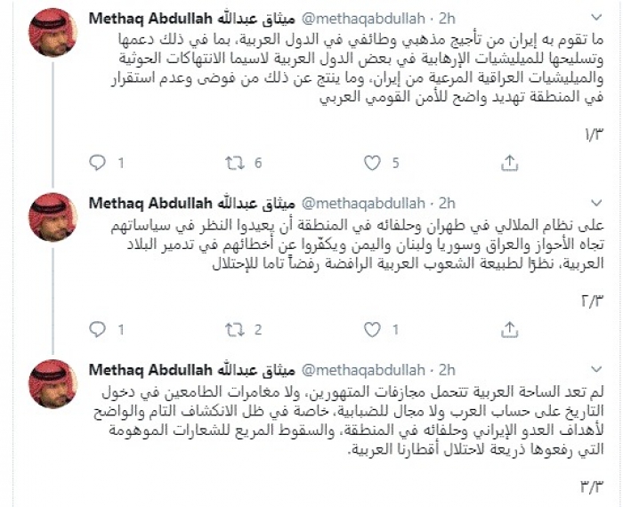 وقال في تغريدات عبر "تويتر" رصدها "المشهد العربي": "ما تقوم به إيران من تأجيج مذهبي وطائفي في الدول العربية، بما في ذلك دعمها وتسليحها للمليشيات الإرهابية في بعض الدول العربية لاسيما الانتهاكات الحوثية والمليشيات العراقية المرعية من إيران، وما ينتج عن ذلك من فوضى وعدم استقرار في المنطقة تهديد واضح للأمن القومي العربي".