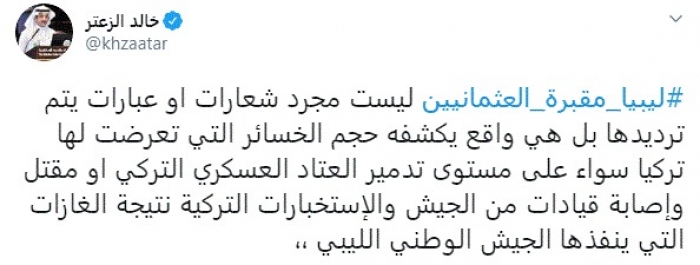 وكتب في تغريدة عبر "تويتر" رصدها "المشهد العربي": "ليبيا مقبرة العثمانيين ليست مجرد شعارات أو عبارات يتم ترديدها بل هي واقع يكشفه حجم الخسائر التي تعرضت لها تركيا سواء على مستوى تدمير العتاد العسكري التركي أو مقتل وإصابة قيادات من الجيش والاستخبارات التركية نتيجة الغازات التي ينفذها الجيش الوطني الليبي".