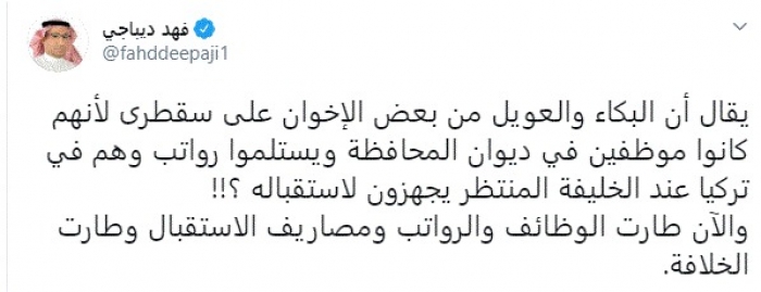 وقال في تغريدة عبر "تويتر" رصدها "المشهد العربي": "يقال أن البكاء والعويل من بعض الإخوان على سقطرى لأنهم كانوا موظفين في ديوان المحافظة ويستلموا رواتب وهم في تركيا عند الخليفة المنتظر يجهزون لاستقباله"