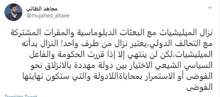 وقال في تغريدة عبر "تويتر" رصدها "المشهد العربي": "نزال المليشيات مع البعثات الدبلوماسية والمقرات المشتركة مع التحالف الدولي، يعتبر نزال من طرف واحد".