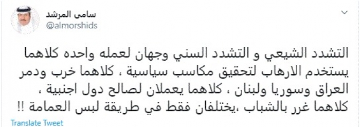 وكتب في تغريدة عبر "تويتر" رصدها "المشهد العربي": "التشدد الشيعي والتشدد السني وجهان لعملة واحدة كلاهما يستخدم الإرهاب لتحقيق مكاسب سياسية، كلاهما خرب ودمر العراق وسوريا ولبنان، كلاهما يعملان لصالح دول أجنبية، كلاهما غرر بالشباب، يختلفان فقط في طريقة لبس العمامة".
