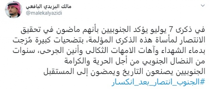 وكتب في تغريدة عبر "تويتر" رصدها "المشهد العربي": "ذكرى 7 يوليو يؤكد الجنوبيين بأنهم ماضون في تحقيق الانتصار لمأساة هذه الذكرى المؤلمة".