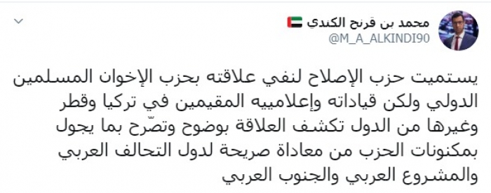 وكتب عبر تغريدة له على "تويتر" رصدها " المشهد العربي":"يستميت حزب الإصلاح لنفي علاقته بحزب الإخوان المسلمين الدولي ولكن قياداته وإعلامييه المقيمين في تركيا وقطر وغيرها من الدول تكشف العلاقة بوضوح وتصّرح بما يجول بمكنونات الحزب من معاداة صريحة لدول التحالف العربي والمشروع العربي والجنوب العربي".