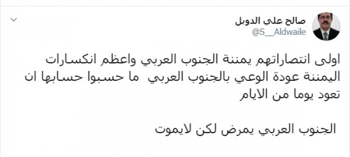 وكتب عبر تغريدة له على "تويتر" رصدها "المشهد العربي": "أولى انتصاراتهم يمننة الجنوب العربي، وأعظم انكسارات اليمننة عودة الوعي بالجنوب العربي ما حسبوا حسابها أن تعود يوما من الأيام، الجنوب العربي يمرض لكن لا يموت".