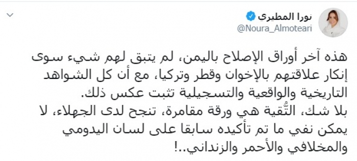 وكتبت عبر تغريدة لها على "تويتر" رصدها "المشهد العربي": "هذه آخر أوراق الإصلاح باليمن، لم يتبق لهم شيء سوى إنكار علاقتهم بالإخوان وقطر وتركيا، مع أن كل الشواهد التاريخية والواقعية والتسجيلية تثبت عكس ذلك.