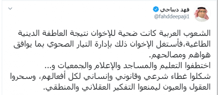 وكتب عبر تغريدة له على "تويتر" رصدها " المشهد العربي": "الشعوب العربية كانت ضحية للإخوان نتيجة العاطفة الدينية الطاغية، فأستغل الإخوان ذلك بإدارة التيار الصحوي بما يوافق هواهم ومصالحهم".
