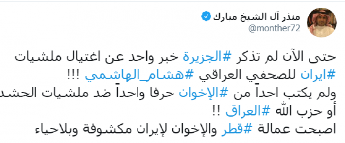 وكتب عبر تغريدة له على "تويتر" رصدها " المشهد العربي":"حتى الآن لم تذكر الجزيرة خبرا واحد عن اغتيال مليشيات إيران للصحفي العراقي هشام الهاشمي،ولم يكتب أحدا من الإخوان حرفا واحداً ضد مليشيات الحشد أو حزب الله العراق، أصبحت عمالة قطر والإخوان لإيران مكشوفة وبلا حياء".