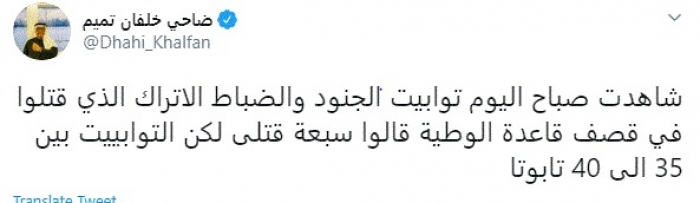 وقال في تغريدة عبر "تويتر" رصدها "المشهد العربي": "شاهدت صباح اليوم توابيت الجنود والضباط الاتراك الذي قتلوا في قصف قاعدة الوطية قالوا سبعة قتلى لكن التوابييت بين 35 الى 40 تابوتا".