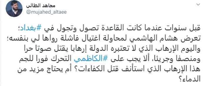 وأضاف: "واليوم الإرهاب الذي لا تعتبره الدولة إرهابا يقتل صوتا حرا ومنصفا وجريئا، ألا يجب على الكاظمي التحرك فورا للجم هذا الإرهاب الذي استأنف قتل الكفاءات؟ أم يحتاج مزيد من الدماء؟".