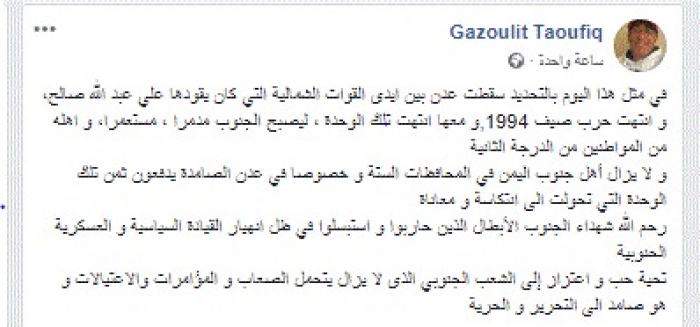 علق الإعلامي المغربي والمراسل السابق لتلفزيون الشرق الأوسط MBC في الجنوب أثناء حرب صيف 1994 توفيق غازوليت، على ذكرى احتلال الجنوب، مؤكدًا أن شعب الجنوب لا يزال يتحمل الصعاب والمؤامرات والاغتيالات وهو صامد إلى التحرير والحرية.