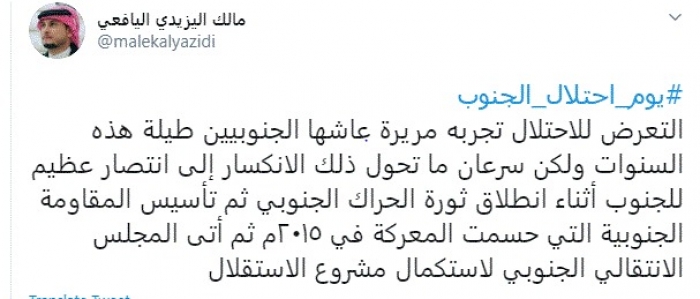 وقال في تغريدة عبر "تويتر" رصدها "المشهد العربي": " التعرض للاحتلال تجربة مريرة عاشها الجنوبيين طيلة هذه السنوات ولكن سرعان ما تحول ذلك الانكسار إلى انتصار عظيم للجنوب".