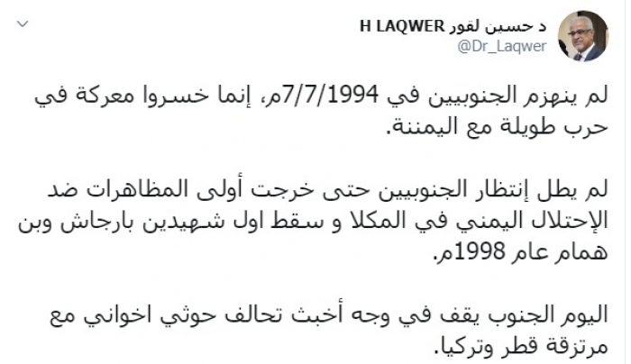 وكتب عبر تغريدة له على "تويتر" رصدها "المشهد العربي": "لم ينهزم الجنوبيون في 7/7/1994م، إنما خسروا معركة في حرب طويلة مع اليمننة، لم يطل انتظار الجنوبيون حتى خرجت أولى المظاهرات ضد الاحتلال اليمني في المكلا وسقط أول شهيدين بارجاش وبن همام عام 1998م".