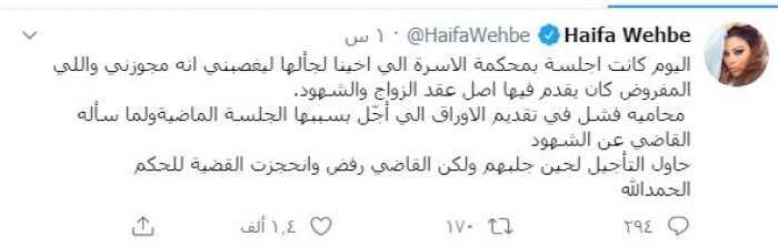 علقت الفنانة اللبنانية هيفاء وهبي، عبر حسابها الرسمي بموقع تويتر، على جلسة أمس بمحكمة الأسرة، والتي رفع فيها مدير أعمالها السابق محمد وزيري، دعوى لإثبات زواجه منها.