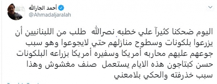 وقال في تغريدة عبر "تويتر" رصدها "المشهد العربي": "اليوم ضحكنا كثيرآ علي خطبة نصرالله طلب من اللبنانيين أن يزرعوا بلكونات وسطوح منازلهم حتى لا يجوعوا وهو سبب جوعهم عليهم محاربة أمريكا وسفيرة أمريكا بزراعة البلكونات حسن كبتاجون هذه الايام يستعمل صنف مغشوش وهذا سبب خذرفته والحكي بلا معني".