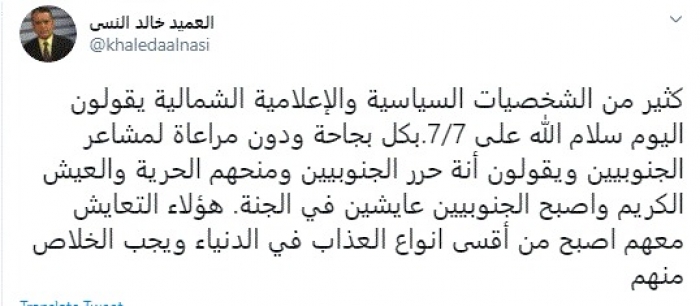 وقال في تغريدة عبر "تويتر" رصدها "المشهد العربي": "كثير من الشخصيات السياسية والإعلامية الشمالية يقولون اليوم سلام الله على 7/7".