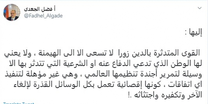وكتب في تغريدة عبر "تويتر" رصدها "المشهد العربي": "القوى المتدثرة بالدين زورًا لا تسعى إلا إلى الهيمنة، ولا يعني لها الوطن الذي تدعي الدفاع عنه أو الشرعية التي تتدثر بها إلا وسيلة لتمرير أجندة تنظيمها العالمي".