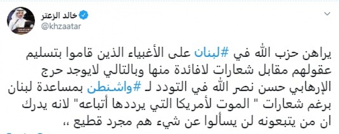 وقال في تغريدة عبر "تويتر" رصدها "المشهد العربي": "يراهن حزب الله في لبنان على الأغبياء الذين قاموا بتسليم عقولهم مقابل شعارات لا فائدة منها وبالتالي لا يوجد حرج الإرهابي حسن نصر الله في التودد لواشنطن بمساعدة لبنان برغم شعارات الموت لأمريكا التي يرددها أتباعه لأنه يدرك أن من يتبعونه لن يسألوا عن شيء هم مجرد قطيع".