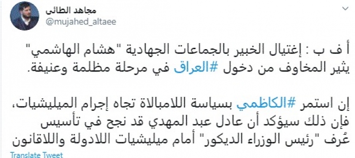 وقال في تغريدة عبر "تويتر" رصدها "المشهد العربي": " أ ف ب: اغتيال الخبير بالجماعات الجهادية هشام الهاشمي يثير المخاوف من دخول العراق في مرحلة مظلمة وعنيفة. إن استمر الكاظمي بسياسة اللامبالاة تجاه إجرام المليشيات، فإن ذلك سيؤكد أن عادل عبد المهدي قد نجح في تأسيس عُرف رئيس الوزراء الديكور أمام مليشيات اللادولة واللاقانون".