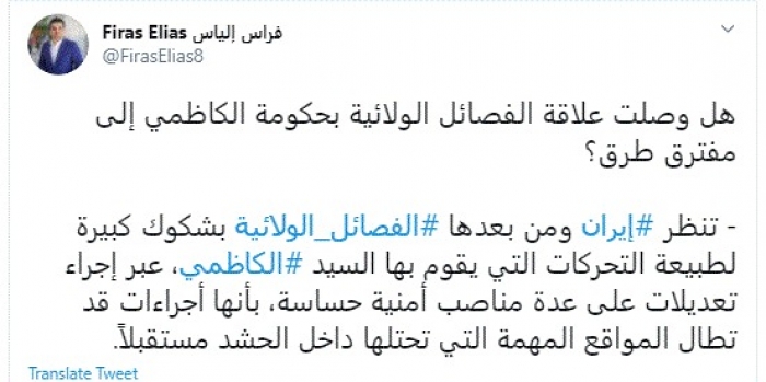 وقال في تغريدات عبر "تويتر" رصدها "المشهد العربي": "هل وصلت علاقة الفصائل الولائية بحكومة الكاظمي إلى مفترق طرق؟".