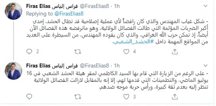 وواصل: "على الرغم من الزيارة التي قام بها السيد الكاظمي لمقر هيئة الحشد الشعبي في 16 يوليو الماضي، والتطمينات التي قدمها لهم، إلا إنه بالمقابل لازالت الفصائل الولائية تنظر إليه بعدم ثقة كبيرة، ورأس حربة موجه ضدهم".