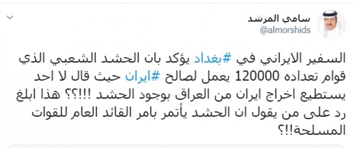 وكتب عبر تغريدة له على "تويتر" رصدها " المشهد العربي":"السفير الإيراني في بغداد يؤكد بأن الحشد الشعبي الذي قوام تعداده 120000 يعمل لصالح إيران حيث قال لا أحد يستطيع إخراج إيران من العراق بوجود الحشد، هذا أبلغ رد على من يقول إن الحشد يأتمر بأمر القائد العام للقوات المسلحة؟".