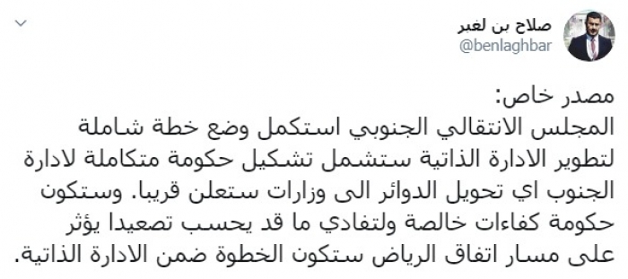 وكتب عبر تغريدة له على "تويتر" رصدها "المشهد العربي": "مصدر خاص، المجلس الانتقالي الجنوبي استكمل وضع خطة شاملة لتطوير الإدارة الذاتية ستشمل تشكيل حكومة متكاملة لإدارة الجنوب أي تحويل الدوائر إلى وزارات ستعلن قريبا، وستكون حكومة كفاءات خالصة ولتفادي ما قد يحسب تصعيدا يؤثر ستكون الخطوة ضمن الإدارة الذاتية".