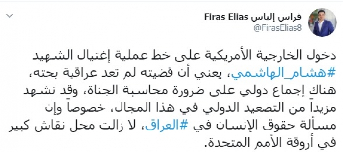 وكتب عبر تغريدة له على "تويتر" رصدها " المشهد العربي": "دخول الخارجية الأمريكية على خط عملية اغتيال الشهيد هشام الهاشمي، يعني أن قضيته لم تعد عراقية بحته، هناك إجماع دولي على ضرورة محاسبة الجناة، وقد نشهد مزيداً من التصعيد الدولي في هذا المجال، خصوصاً وإن مسألة حقوق الإنسان في العراق، لا زالت محل نقاش كبير في أروقة الأمم المتحدة".