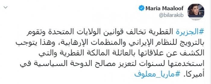 أكدت الإعلامية اللبنانية ماريا معلوف، اليوم الخميس، أن الجزيرة القطرية تروج للنظام الإيراني والمنظمات الإرهابية.