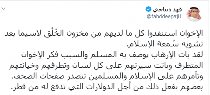 وكتب عبر تغريدة له على "تويتر" رصدها " المشهد العربي": "الإخوان استنفذوا كل ما لديهم من مخزون الخُلُق لاسيما بعد تشويه سُمعة الإسلام، لقد بات الإرهاب يوصف به المسلم والسبب فكر الإخوان المتطرف وباتت سيرتهم على كل لسان وتطرفهم وخيانتهم وتآمرهم على الإسلام والمسلمين تتصدر صفحات الصحف".