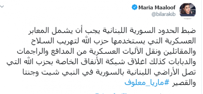 وكتبت عبر تغريدة لها على "تويتر" رصدها " المشهد العربي": "ضبط الحدود السورية اللبنانية يجب أن يشمل المعابر العسكرية التي يستخدمها حزب الله لتهريب السلاح والمقاتلين ونقل الآليات العسكرية من المدافع والراجمات والدبابات، كذلك إغلاق شبكة الأنفاق الخاصة بحزب الله التي تصل الأراضي اللبنانية بالسورية في النبي شيت وجنتا والقصير".